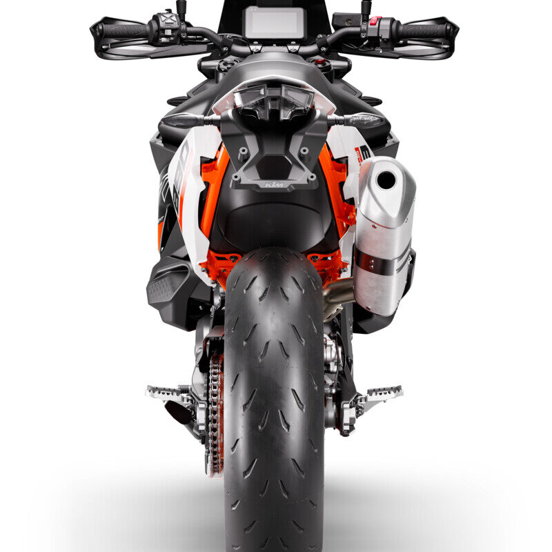 The 2024 KTM 890 SMT allows you to set up your ride to your own preferences. Fitted with rebound and compression damping adjusters on the top cap of the fork legs, this makes for quick and easy adjustment for different types of riding usage. Want to attack the mountain pass, then simply dial in the clickers, or if you out for a brisk but steady ride then soften up the setup. On the rear, the shock features a rebound damping adjuster and a hand adjuster for spring preload. The rebound damping adjustability allows the rider to adapt the shock behavior to different riding situations, while the spring preload adjuster can be tailored for luggage, passenger loads or for those full mountain attacks.